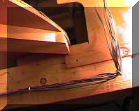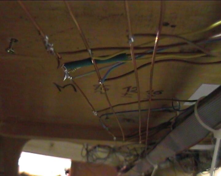 1.Hauptspannungen offen verlegt Um jederzeit schnell an meine drei verwendeten Hauptspannungen zu gelangen, habe ich diese vier Kabel (gemeinsame Masse, +12V, +16V, ~16V) unisoliert quer unter dem Plattenboden, durch Listerklemmen auf einen Abstand von ca. 1,5mm gehalten (damit kein Kurzschluss entsteht), angebracht. Wo ich auch gerade Strom benötige, löte ich jetzt nur noch meinen Draht an das jeweilige Kabel an.