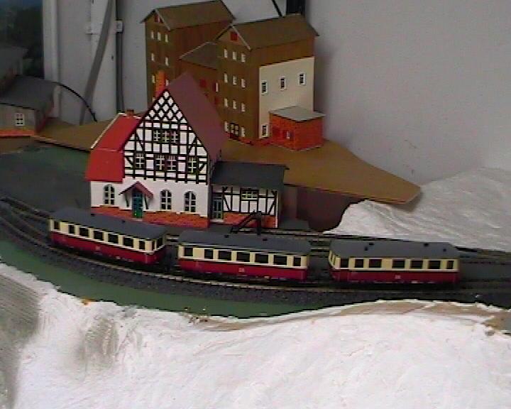 Welcher kleine Junge träumte denn nicht von einer Modelleisenbahn. So auch ich. Und irgendwann bekam ich dann ein Gleisoval, einen Trafo, zwei Weichen und einen Zug in der Baugröße H0 zum Weihnachtsfest geschenkt. Das war dann die Basis der heutigen Anlage. Als dann ausreichend Platz zur Verfügung stand wurde groß geplant und gezeichnet. Es sollte die Zeit des Wechsels von Dampftraktion zur Dieseltraktion dargestellt werden, ohne mich auf eine bestimmte Epoche festzulegen. Fertig ist meine Modelleisenbahn noch lange nicht.  Ich muss ja immer wieder etwas zum Basteln haben.